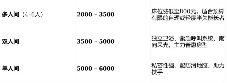 示例:一位半失能老人住双人间,月综合费用 ≈ 3500(床)+ 2000(护)+ 900(餐)= 6400元/月;若为低保家庭,实际支出可控制在 2000元以内。