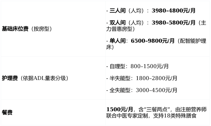 采用 “床位费 + 分级护理费 + 餐费” 模块化透明计价,所有费用经民政与物价部门备案公示,无隐性消费、无会员费。