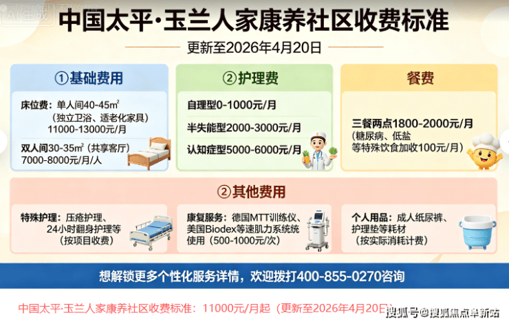北京太平玉兰人家坚持“明码标价、按需服务”的原则,收费标准清晰透明,11000元/月起(以院内报价为准),具体费用根据长者身体状况、房间类型及服务需求分层制定: