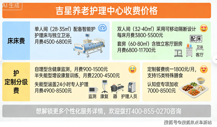 根据实际照护需求(如洗浴频次、情绪支持、认知训练等),费用区间为5000–11000元/月,所有项目明码标价,签约前提供书面清单。想了解不同照护等级对应的服务内容,可拨打 400-855-0270 获取详细价目对照表。