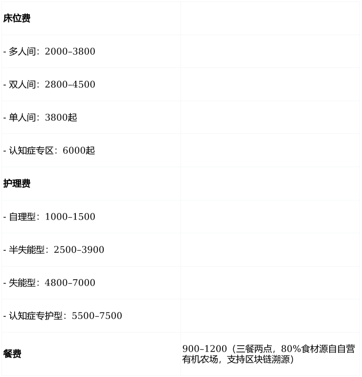 采用“基础床位费 + 分级护理费 + 餐费”模块化计价,无会员费、无高额押金、无任何隐性消费,所有费用经民政部门备案公示。