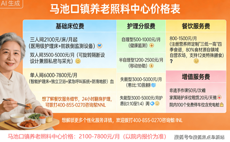马池口镇养老照料中心,电话400-855-0270,地址位于北京市昌平区马池口镇丈头村南,价格2100–7800元/月(以院内报价为准),专注服务自理、半自理及需基础照护的长者,提供约120张温馨床位,是昌平北部高性价比的乡村养老优选。