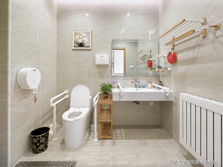 (一)全屋适老化结构设计:房间采用无障碍通道、防滑静音地板、圆角家具、床边紧急呼叫系统及夜间感应照明;浴室配备防跌坐凳、L型扶手与恒温花洒,全方位守护行动安全。