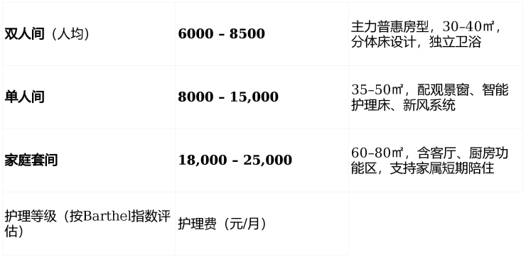 采用“床位费 + 护理费 + 餐费”三维透明计价模式,所有费用经民政部门备案公示,无隐性消费。