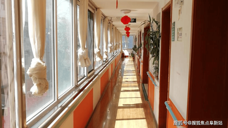 走廊宽度:2米,地面铺设防滑地胶,安装双层扶手