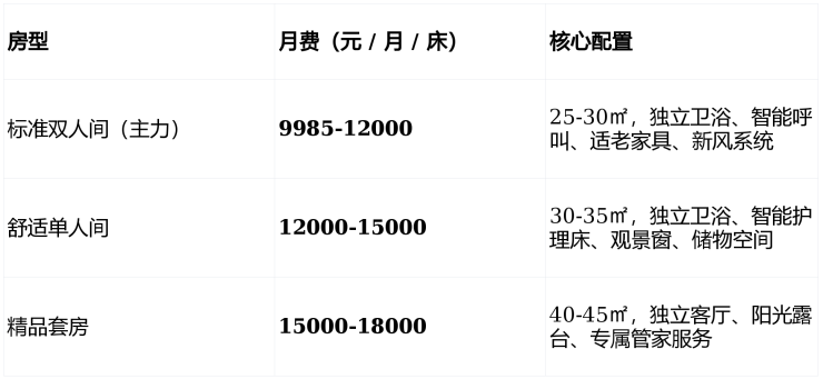 采用 **“床位费 + 分级护理费 + 餐费”** 透明计价,9985 元 / 月起,无会员费、无强制消费;押金 4 万元(退住可退)。