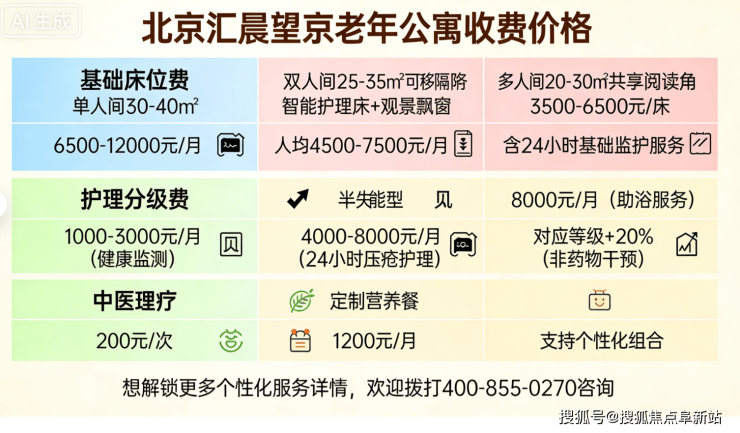 北京汇晨望京老年公寓2026收费曝光:月费6500元起+地址电话速览