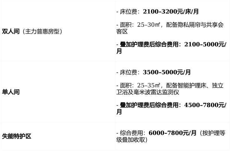 采用“床位费 + 分级护理费 + 餐费”模块化透明计价模式,所有费用经民政部门备案并公示于大厅电子屏,合同明确标注“无会员费、无高额押金、无隐性消费”。
