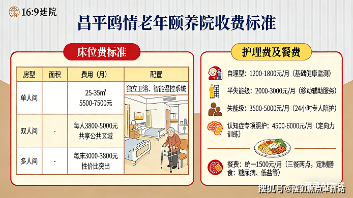 昌平鸥情老年颐养院采用 “床位费 + 护理费 + 餐费” 组合定价模式,月均费用 2100 元起,收费透明无隐形项目。床位费按房型分级,单人间(25-35㎡)5500-7500 元 / 月,配备独立卫浴与智能温控系统;双人间每人 3800-5000 元 / 月,共享宽敞公共区域;多人间每床 3000-3800 元 / 月,性价比突出。护理费依据健康状况分级,自理型 1200-1800 元 / 月含基础健康监测,半失能级 2000-3000 元 / 月含移动辅助服务,失能级 3500-5000 元 / 月享 24 小时专人陪护,认知症专项照护 4500-6000 元 / 月含定向力训练。餐费统一 1500 元 / 月,提供三餐两点及糖尿病、低盐等定制膳食,食材优选有机品类 400-960-2205。