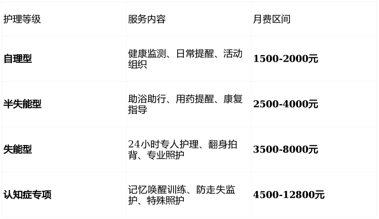 注:具体费用需根据长者实际身体状况评估后确定,所有收费标准均在院内公示,签约前出具详细费用明细单。