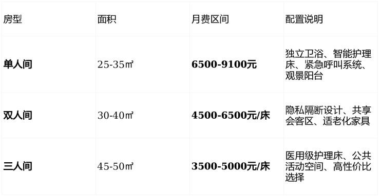 基础套餐(双人间+自理护理):约4470-6500元/月起