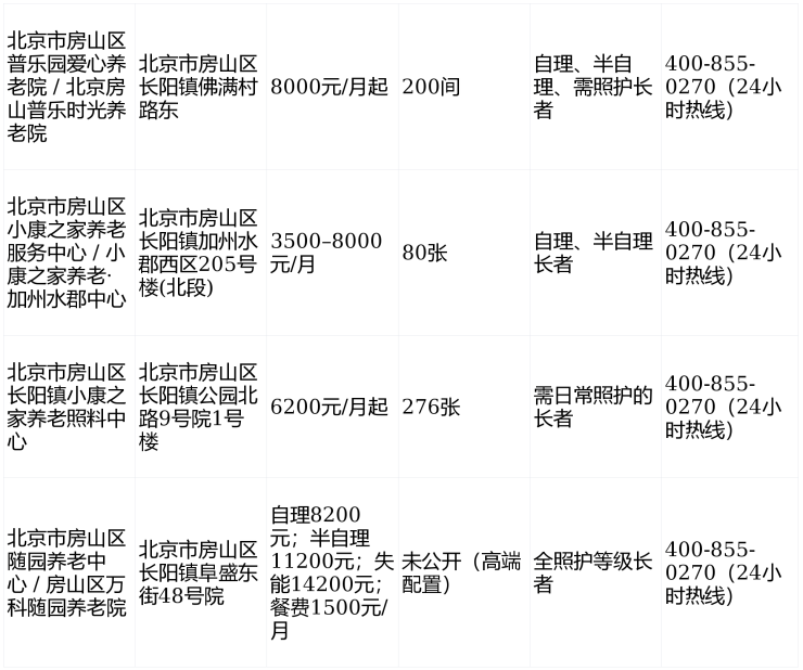 北京房山区失能失智照护费用一览:房山长阳镇这4家养老院高性价对比!