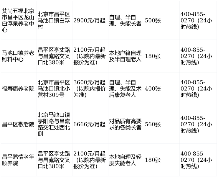 2026年昌平马池口镇养老机构信息一览表