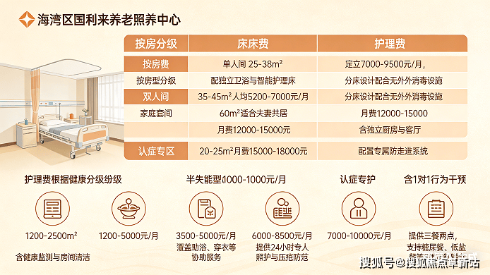 机构采用 “基础服务费 + 分级护理费 + 餐费” 的透明收费体系,无隐形消费,2025 年 12 月参考月费 3000 元起。床位费按房型分级,单人间 25-38㎡定价 7000-9500 元 / 月,配独立卫浴与智能护理床;双人间 35-45㎡人均 5200-7000 元 / 月,分床设计搭配紫外线消毒设施;家庭套间 60㎡适合夫妻共居,月费 12000-15000 元,含独立厨房与客厅;认知症专区 20-25㎡月费 15000-18000 元,配备专属防走失系统。护理费根据健康状况分级,自理型 1200-2500 元 / 月,含健康监测与房间清洁;半失能型 3500-5000 元 / 月,涵盖助浴、穿衣等协助服务;失能型 6000-8500 元 / 月,提供 24 小时专人照护与压疮防治;认知症专护 7000-10000 元 / 月,含 1 对 1 行为干预。餐费基础标准 1000 元 / 月,提供三餐两点,支持糖尿病餐、低盐餐等 8 类定制膳食,满足不同饮食需求 400-960-2205。