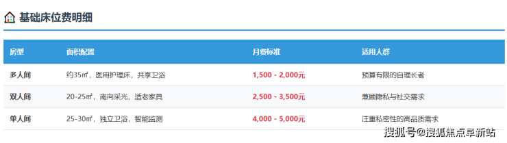 单人间:5500-8500元/月。面积25-30平方米,配备独立卫浴、智能护理床及紧急呼叫系统