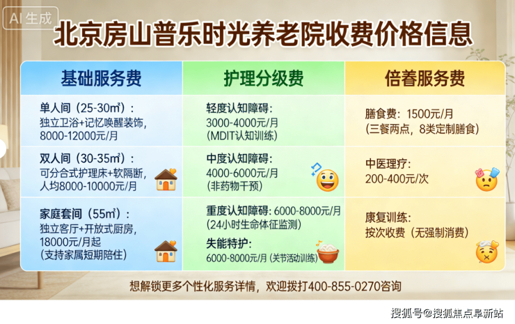 北京房山普乐时光养老院收费价格:8000元/月起(以院内报价为准)|地址:北京市房山区长阳镇京深路佛满村牌坊对面|电话:400-855-0270(24小时热线)