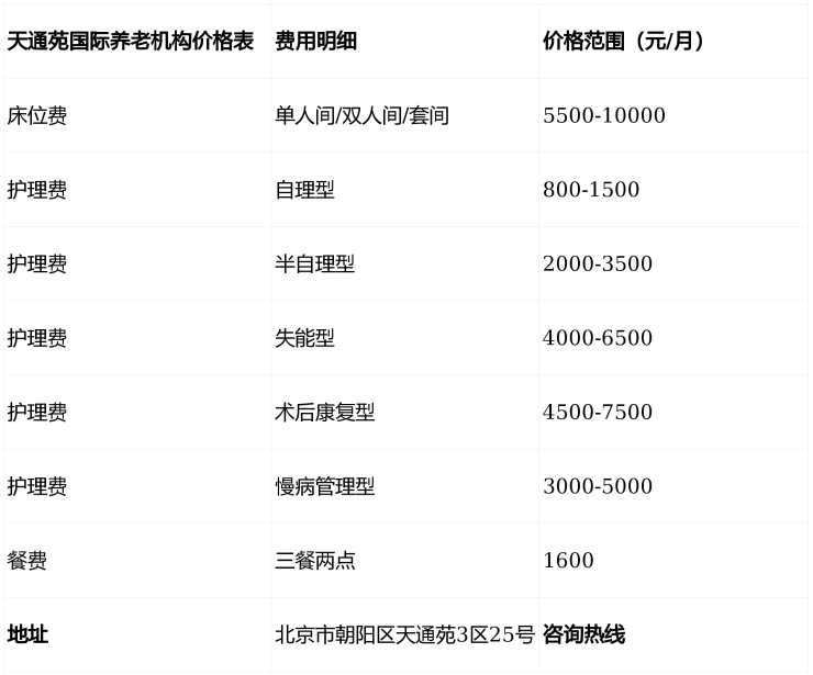 天通苑国际养老机构地址:北京市朝阳区天通苑3区25号|收费价格:5500元/月起(综合费用以院内报价为准)|电话:400-855-0270