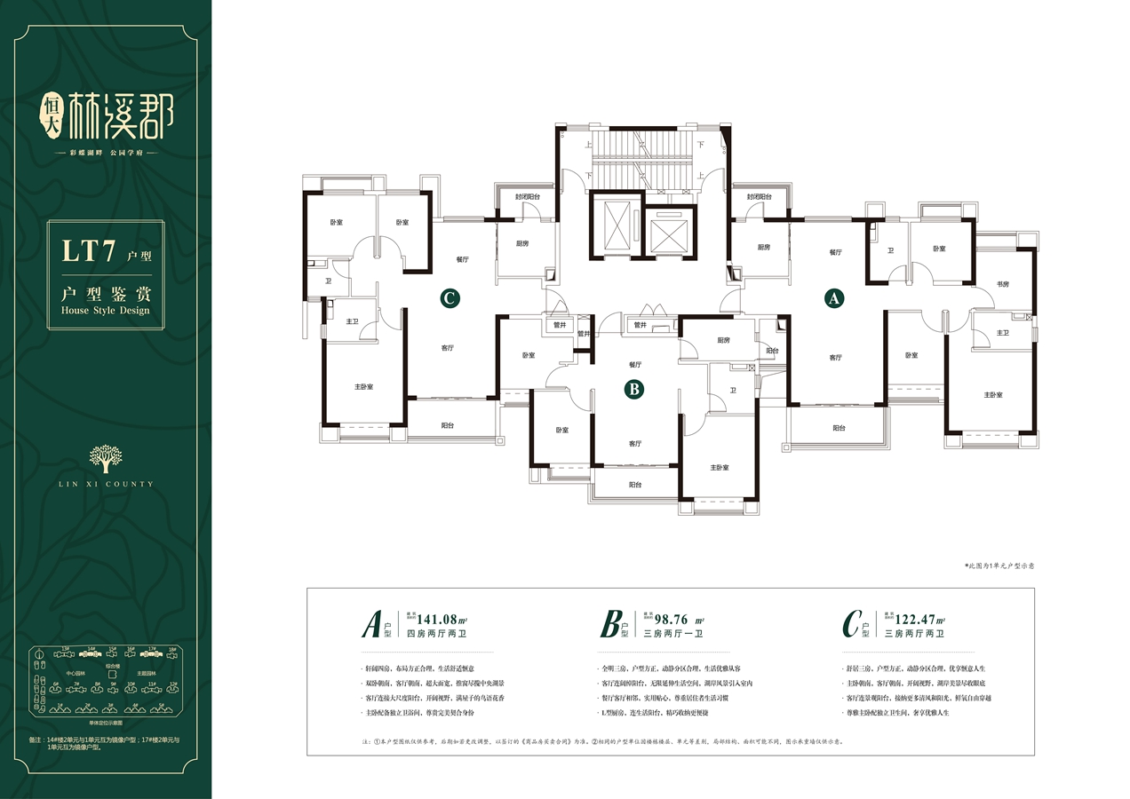 恒大林溪郡整体设计自然大气,整体布局坐北朝南、北高南低,错落有致,形成多层次公共空间,以贯穿东西的“水轴”和“绿轴”景观主轴联系小区地块。项目占地面积约9.6万方(144亩),地上总建筑面积约21万方,共18栋楼,由13栋高层和5栋小高层(10层)组成。总规划户数1822户,容积率为2.2,绿化率40.02%,超大楼间距。户型建筑面积约90-140㎡品质装修,三房一卫,三房两卫,四房两卫户型,产品丰富,满足不同业主需求。