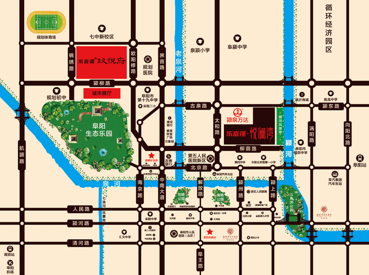 ⑤交通:项目南接城市主干道路颍柳路,颍柳路西侧正在修建的双向8车道颍柳路泉河大桥是阜阳首座独塔索桥,连接颍柳路和航颍路两条城市快速公路主干道。沿航颍路向南一路通达城南新区、阜阳高铁西站和机场。颍柳路向东可直达界首路,向北可直达太和路。