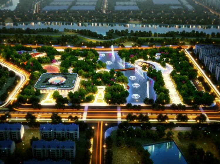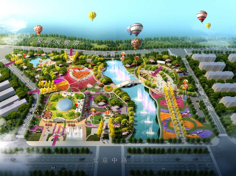 以母亲河泉河为界,分成东西两个板块,东面是筑梦广场和地下停车场,西面是景观公园和主题情景商业街区;
