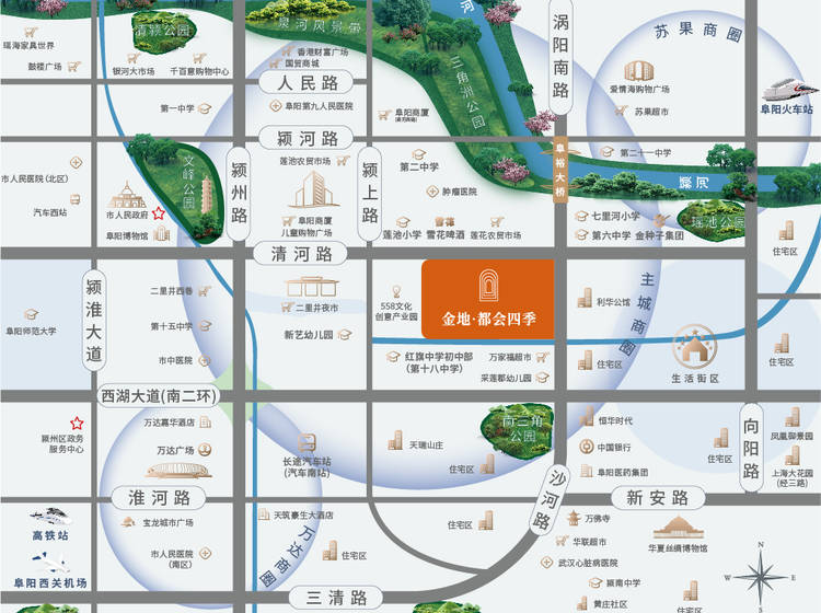 金地·都会四季项目位于清河东路与沙河路交汇处,是中国房企10强金地集团首进阜阳,倾力打造的标杆作品。金地名仕系定位高端产品,以品质彰显优雅与格调。项目总占地为58.22亩,总建面12.2万方,是城市核心纯粹低密居住区。项目分为两个园区规划建设,精致打造3栋瞰景高层,4栋轻奢小高层,6栋城心洋房。项目地处主城区核心位置,人文地标汇聚,繁华商圈林立,生活配套丰盛,依托金地集团丰富的开发经验和主城核心丰富的资源,革新传统主城生活方式,擘画当代阜阳人居封面。
