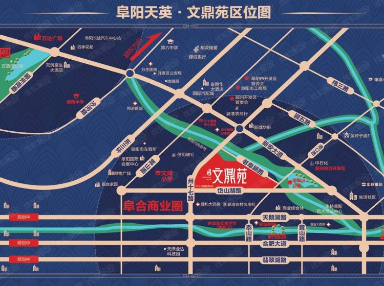 天英·文鼎苑位于经开区州十七路与阜颍路交汇口东南侧,交通便利。毗邻文峰小学和实验中学南区,项目自带幼儿园,满足全学龄各阶段教育需要;紧邻阜颍河公园景观带,环境优美,风景秀丽,是休闲疗养好去处;周边有安徽省较好的甲级医院安医附院,大型商业中心百大合家福,完善的城市综合服务功能能够满足日常生活需要。