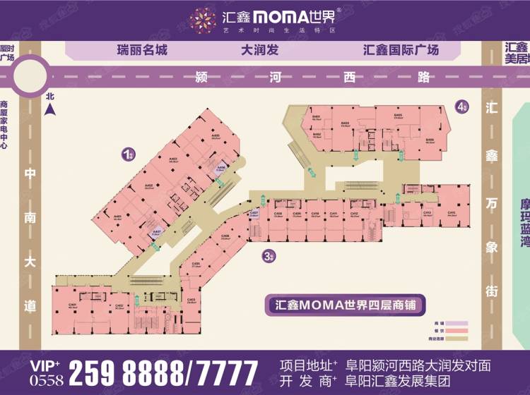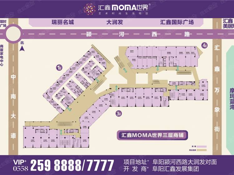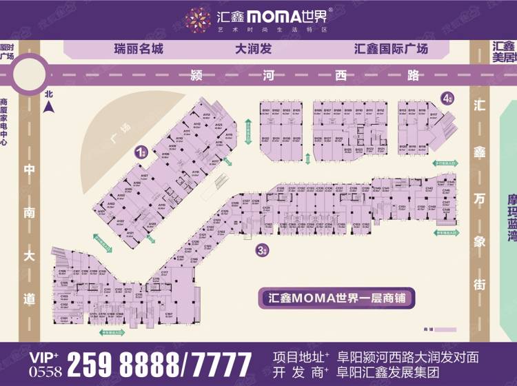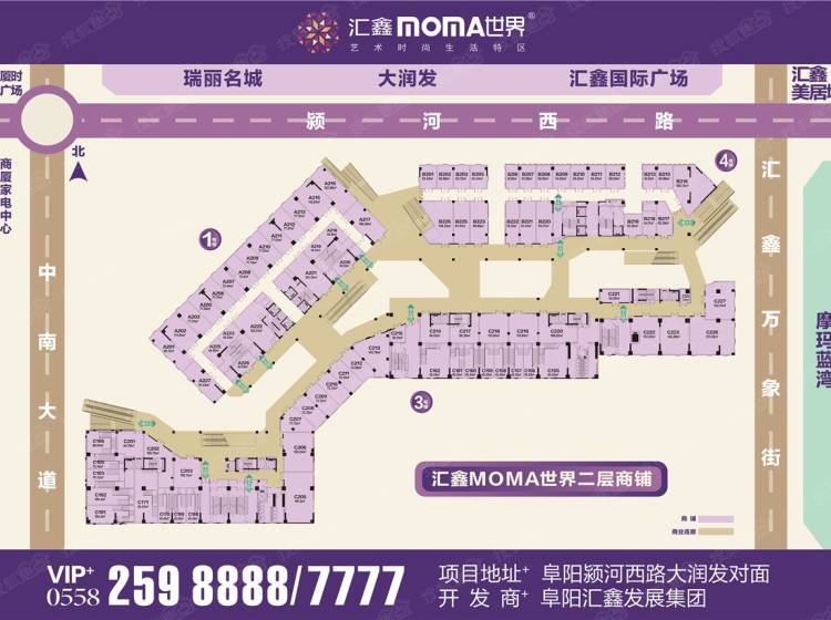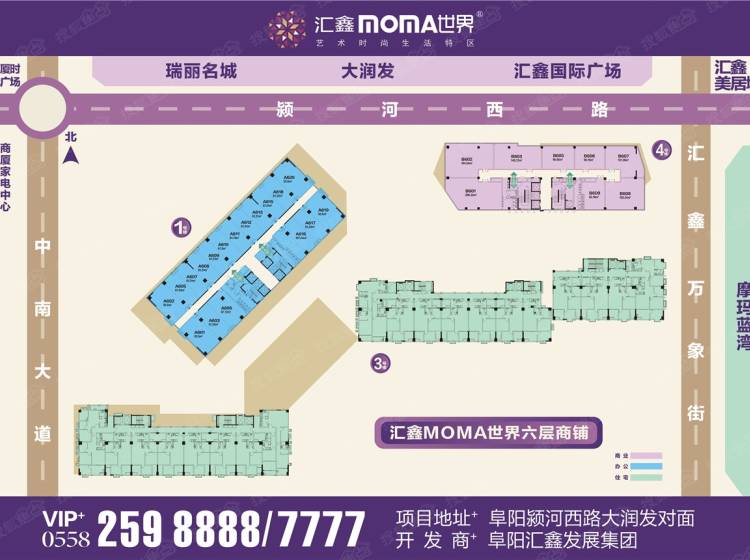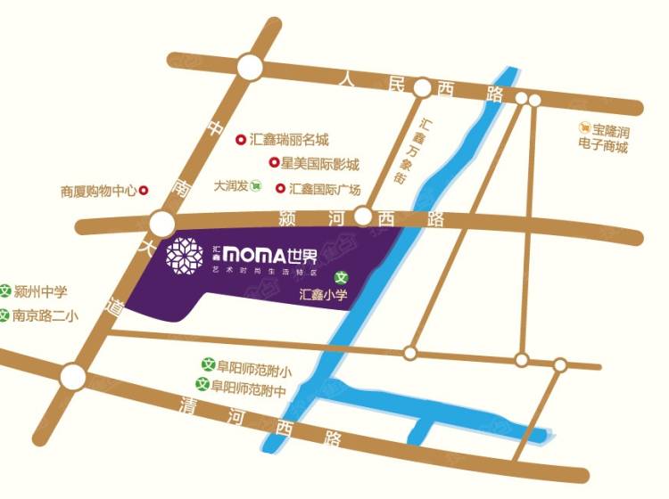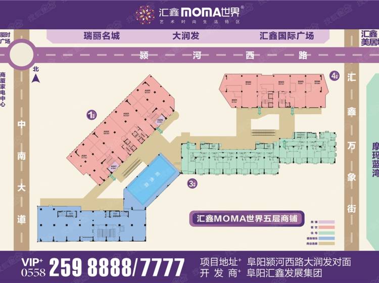 汇鑫MOMA世界,鼎立于阜城西区中心位置,位据颍河西路与中南大道交汇处,总建筑面积约30万平米,由摩玛世界(商业)、摩玛蓝湾(住宅)、摩玛中心(写字楼、酒店)组成开放式现代街区,致力打造阜阳时尚、艺术、生活特区。缔造集住宅、商务酒店、公寓商业、写字楼于一体的潮流街区,成为让三千年阜阳焕新一新的时尚潮流之地。