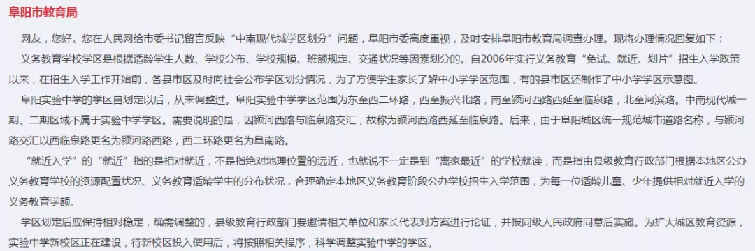 阜阳实验中学的学区自划定以后,从未调整过。阜阳实验中学学区范围为东至西二环路,西至振兴北路,南至颍河西路西延至临泉路,北至河滨路。中南现代城一期、二期区域不属于实验中学学区。需要说明的是,因颍河西路与临泉路交汇,故称为颍河西路西延至临泉路。后来,由于阜阳城区统一规范城市道路名称,与颍河路交汇以西临泉路更名为颍河路西路,西二环路更名为阜南路。“就近入学”的“就近”指的是相对就近,不是指特别地理位置的远近,也就说不一定是到“离家最近”的学校就读,而是指由县级教育行政部门根据本地区公办义务教育学校的资源配置状况、义务教育适龄学生的分布状况,合理确定本地区义务教育阶段公办学校招生入学范围,为每一位适龄儿童、少年提供相对就近入学的义务教育学额。