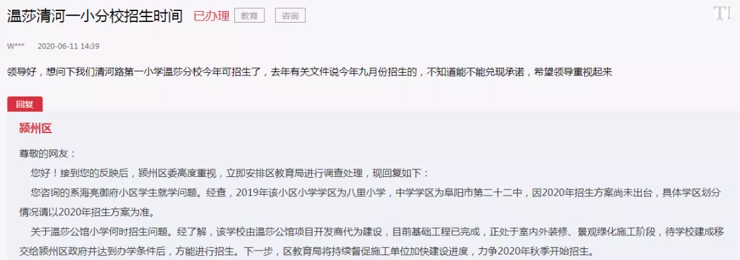 关于温莎公馆小学何时招生问题。经了解,该学校由温莎公馆项目开发商代为建设,目前基础工程已完成,正处于室内外装修、景观绿化施工阶段,待学校建成移交给颍州区政府并达到办学条件后,方能进行招生。下一步,区教育局将持续督促施工单位加快建设进度,力争2020年秋季开始招生。