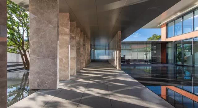 它建筑的选材、大师工艺都尽量达到优质,有二十多万一株的全冠羽毛枫、整块紫红大理石、罗马碧波纹洞石、斯巴达克石材、产地是伊朗的云多拉灰大板、还有西班牙技术传承的江苏“伯陶科”……