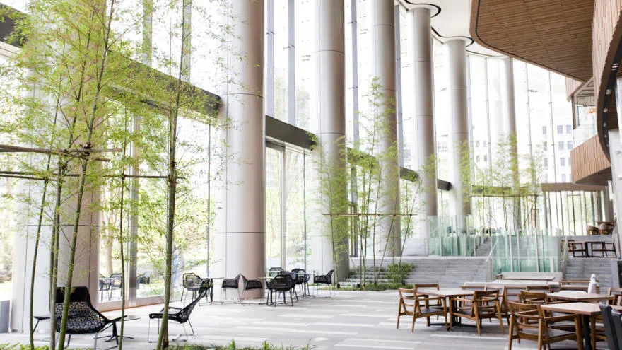 外立面的鱼鳞式单体幕墙呈现的是弧形设计,就像水滴滑落,优美且具现代感,这也为室内营造出了良好的流线造型与空间效果。
