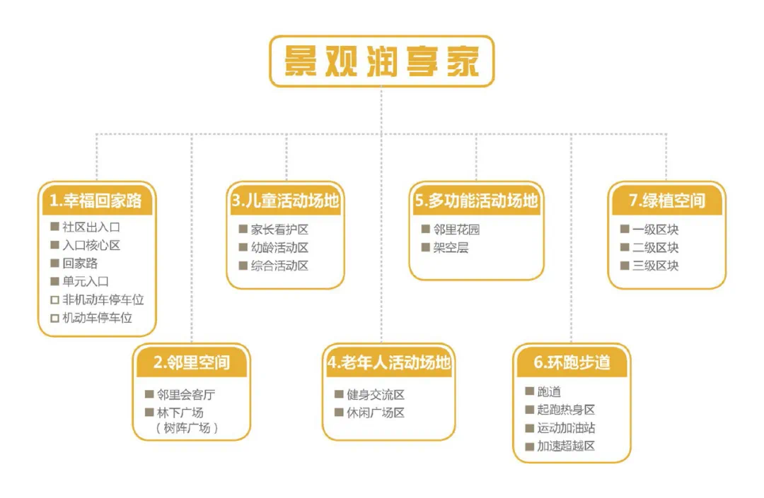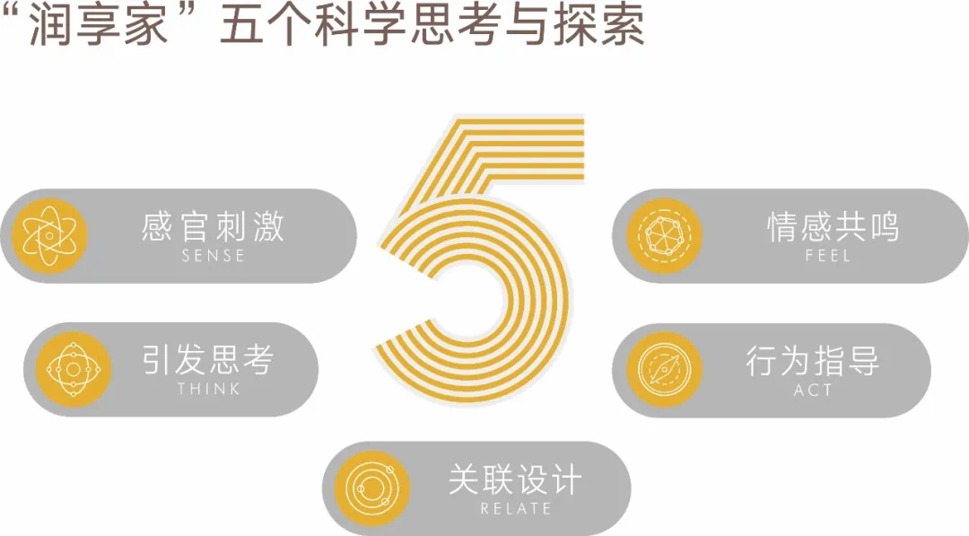 “润享家”在感官刺激(sense)、情感共鸣(feel)、引发思考(think)、行为指导(act)、关联设计(relate)这五个方面进行思考与探索,对未来园林景观趋势进行探索并创新,更科学有效的在社区内规划多功能模块。