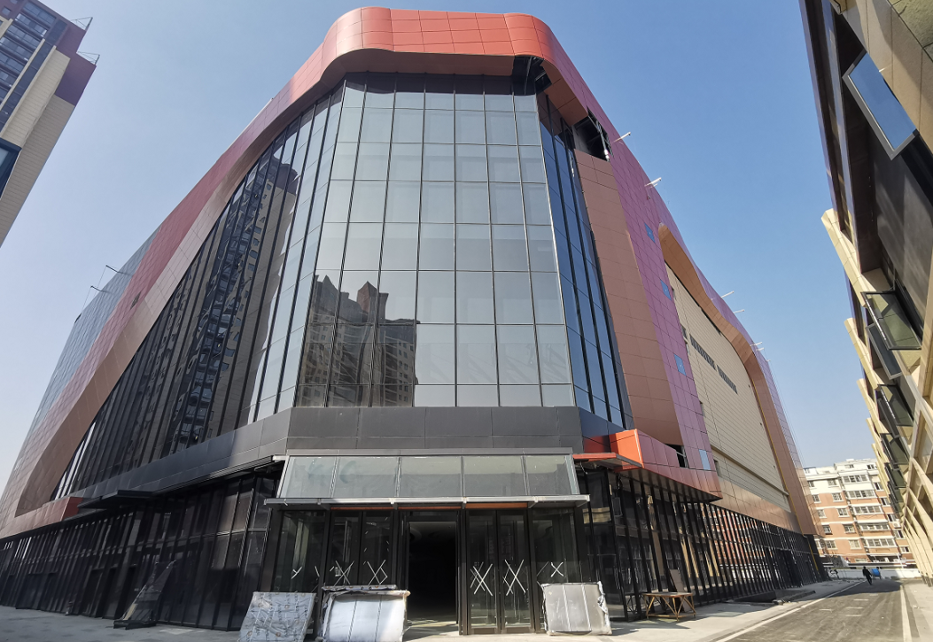 从整体布局,项目建筑外立面呈橙灰相间的色调,玻璃幕墙已装饰,外部工程已接近尾声。