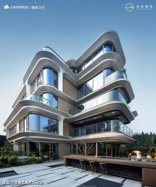 奥体潮鸣冲破了传统的建筑设计框架,立面采用了扎哈·哈迪德标志性的动感曲线,高层住宅以圆弧转角代替传统直角,搭配大面积的玻璃窗运用。基座石材采用葡萄牙进口的树挂冰花石材。叠墅采用了L型的转角观景阳台设计,搭配全面屏落地玻璃窗,打造270°全景视野的超流体立面。