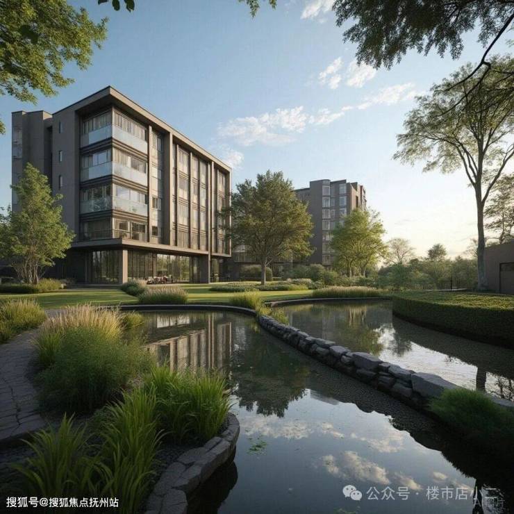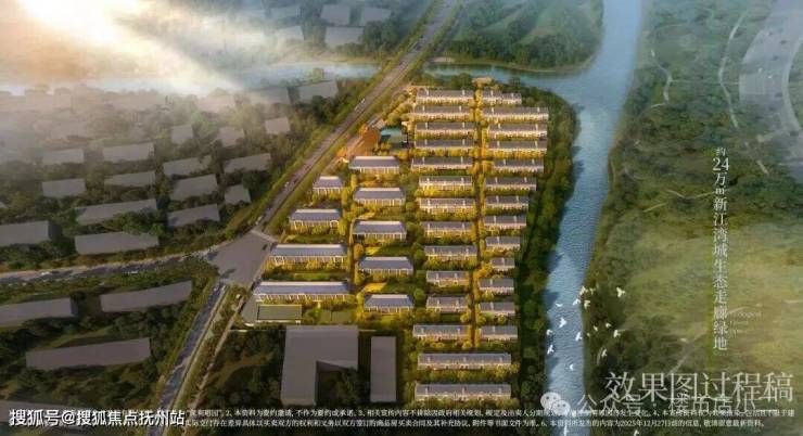 项目东北两侧被新江湾湿地生态系统包裹,形成了“双湾环抱-对望24万㎡湿地公园-内有庄园”的生态格局。楼栋采取东高西低策略,使超过半数楼栋可享受水系与公园景致。