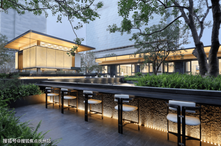 视觉的焦点是一场精心编排的东方叙事:中央镜面水景中,涌泉不息,其潺潺声息宛如一首欢迎曲;水中静立的一株日本冬青,以生命的绿意与稳定的形态,与水景构成一幅“动静相宜”的写意画。