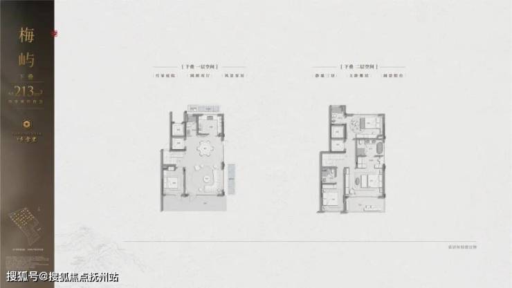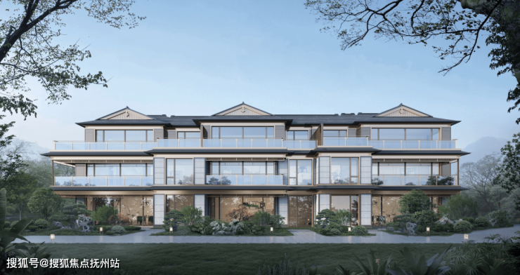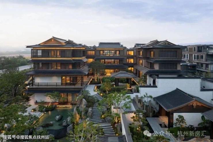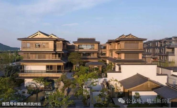 建筑立面:古今交融的诗意表达:外立面以香槟金铝板为基调,搭配蓝眼睛石材与玻璃幕墙,融合传统歇山重檐、纳福悬鱼等元素,既保留宋式建筑的对称美学,又赋予现代建筑的轻盈通透。合院组团采用三面庭院设计,L型景观面与环绕式檐廊,将超山梅影、丁山湖光引入每一扇窗景!