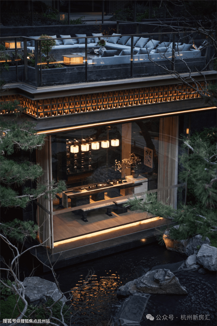 细看,还有歇山重檐、纳福悬鱼、黛墨青瓦、瘦金披檐等元素的点缀,这样的立面设计,将东方建筑之气韵、有形之光影,完美融合。如此超凡的建筑美学,在熙熙攘攘、繁华的杭州城,是独一份的。