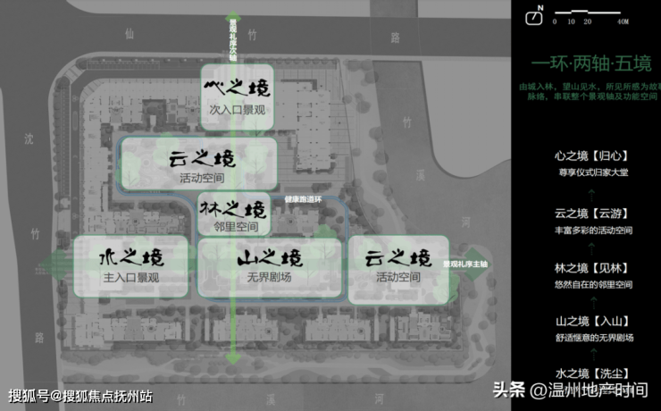 “五境”洗尘-入山-见林-云游-归心,延伸“家”的范畴,凝聚无界社交园林空间,以超凡脱俗的设计理念,还原瓯越千年的诗意风景。