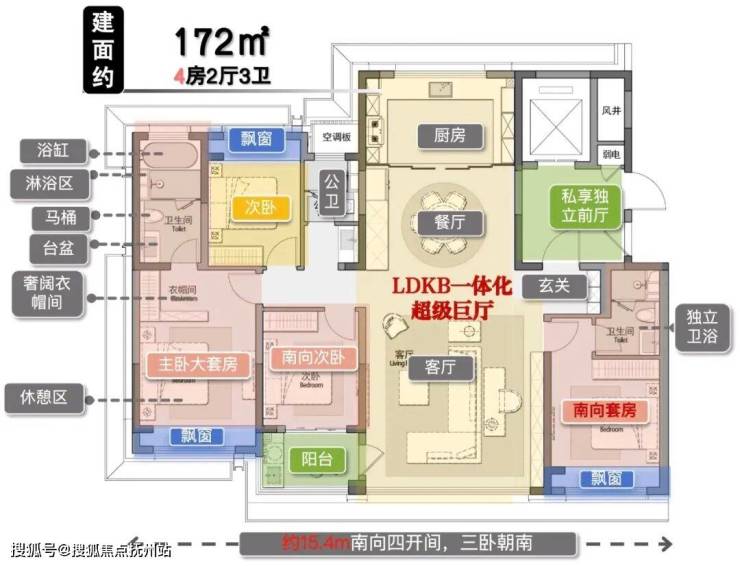 主力户型172㎡和215㎡,都是四开间朝南、双套房。172㎡客厅开间约5.4米,215㎡客厅开间约6.9米,南向总面宽18.1米。大面积飘窗赠送。