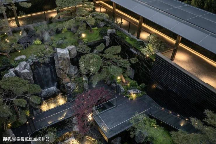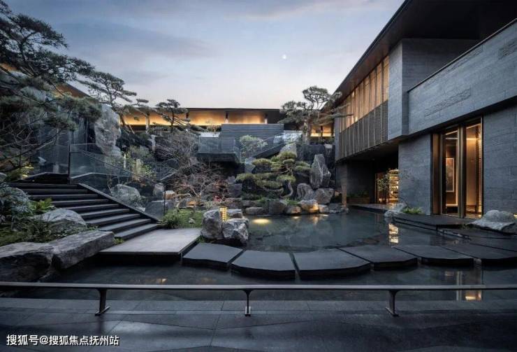 通过高差地势,形成上部悬挑亭廊,中部石阶和叠水,底部山石和汀步的山境庭院景观。