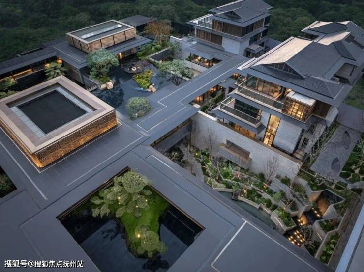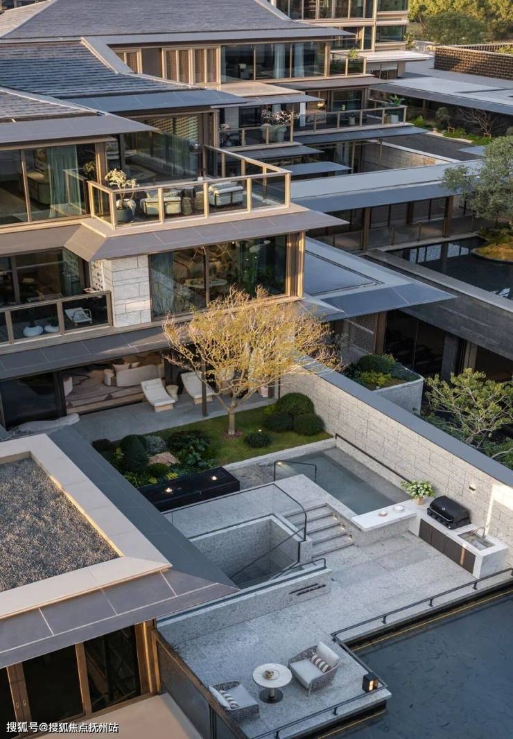庭院直面中央水轴,并因地制宜的定制了浮水亭阁等休闲场景,把江南气韵和有天有地有院落的合院生活充分融合在一起。