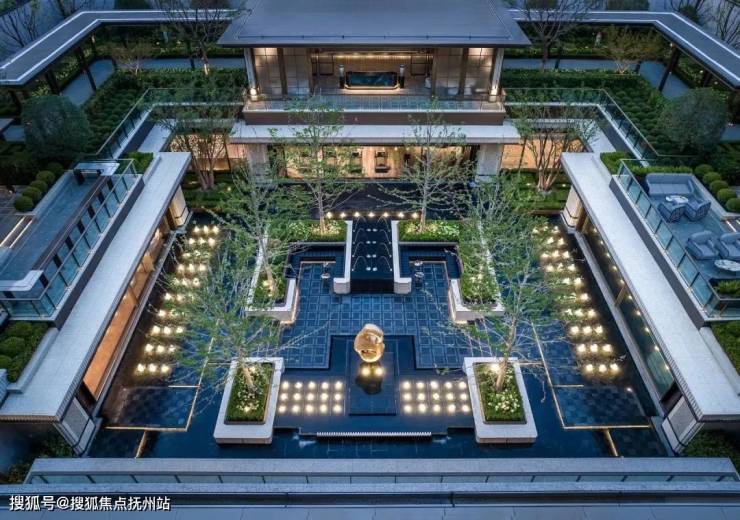 门口是很有对称仪式感的车马院,进门是高度对称的长廊水院,围绕着地面归家大堂展开的架空层、亭廊,以及围绕着下沉式庭院展开的会所空间,同样讲究「中轴对称」。
