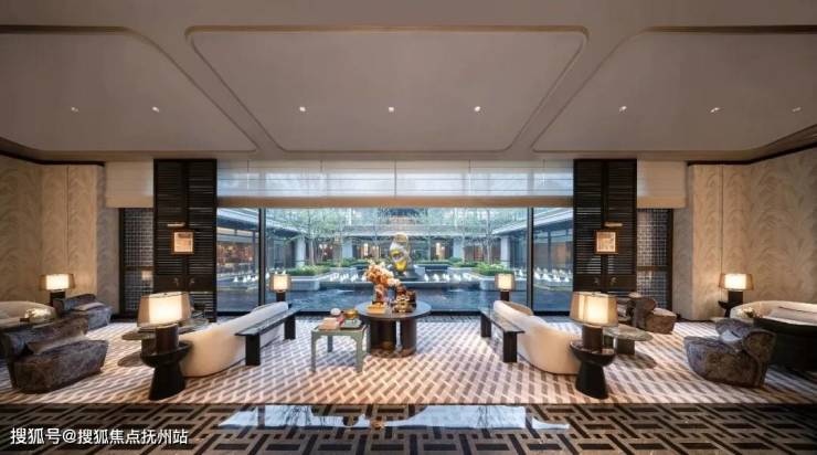 会所大堂当然也是正对着下沉式庭院。紫金·翡丽甲第选用的落地窗,最大的一扇落地窗达到了7.7米宽,把下沉式庭院的水光和天光,无限收入室内。到了晚上,空中会弥漫着鎏金岁月的气息,泳池中的那轮圆月,就在你眼前,照耀着在月光中畅游碧波的人。