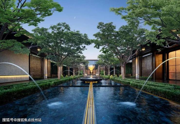 窗外又是高度对称的长廊水院。喷泉与长廊,给你对称仪式感;水光树影,给你静谧;玉石柱式与金属格栅,给你典雅。他们把准宝石级别的「蓝翡翠」奢石,铺装在水底,它有一个很美的名字,叫做「银河的眼泪」;阳光会把池底的那抹蓝色,反射到你的眼底。
