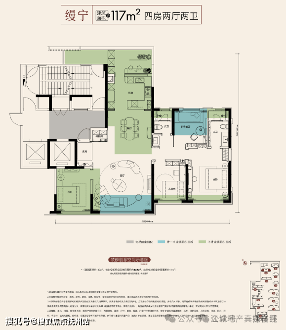 建面约117平的四房两厅两卫:不含电梯前室,优化后得房率约117%!
