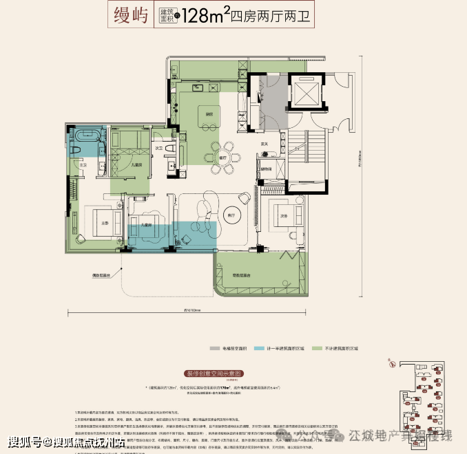 重点来看它的优化面积,绿色区域不计建筑面积,可以看到北侧阳台、厨房餐厅、以及南向的儿童房都相当于是送的。