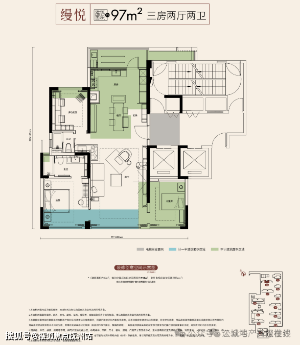 最小户型是建面约97平的三房两厅两卫:不含电梯前室,优化后得房率就有116%左右。