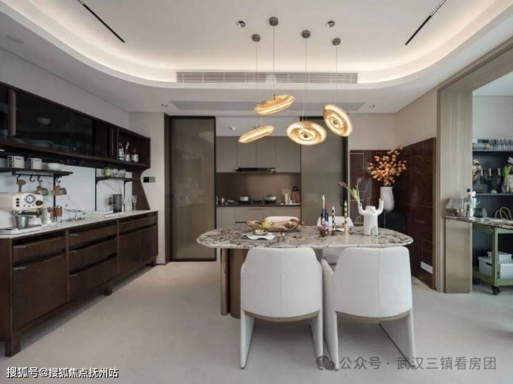 客厅浓厚的文化与独特的艺术气质,洞石及千层岩纹理岩板,厨房夹丝玻璃门中间夹定制绢丝,为空间设计增添了亮点,带来一种优雅高级的质感。