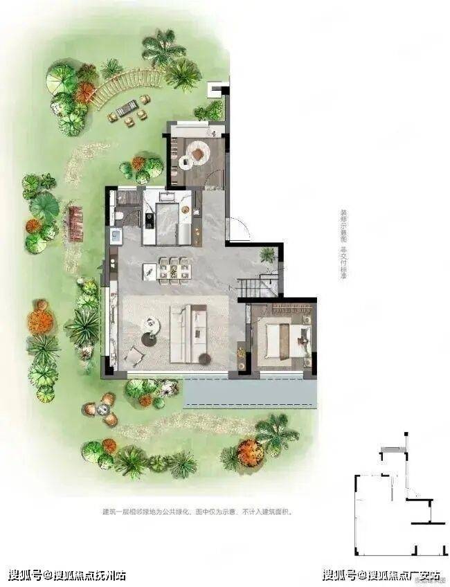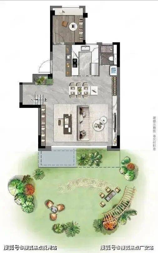 上叠户型,一层LDKB一体化客厅+两个房间,可做老人房或客房。一体化客餐厅直接连通门前绿化,附赠约40-300平庭院。